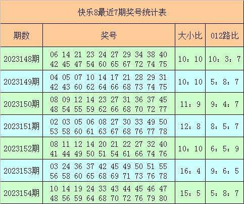 快乐8第2023154期奖号为:10 14 19 24 33 43 44 45 46 47 48 56 59 64 68 70 72 76 79 80,其中奖号012路比为5:8:7,大小比为15:5。