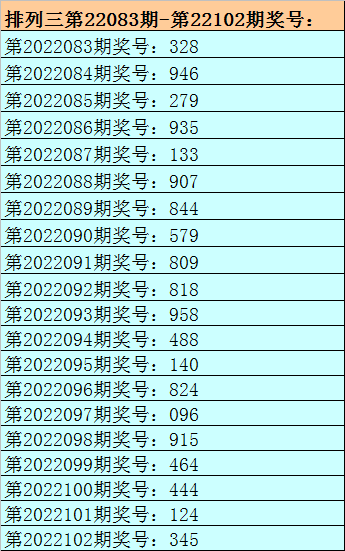 1。排列三最近十期分别开出号码:958-488-140-824-096-915-464-444-124-345,其中有8期奖号开出了上期的重复号码,本期预计第2022102期奖号:345中有重号,参考号码:4。
