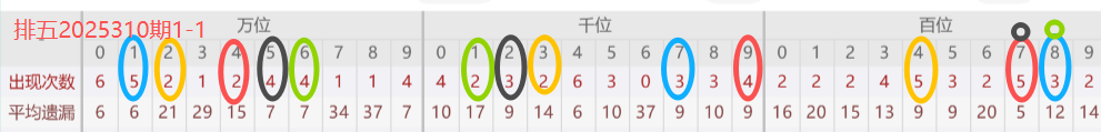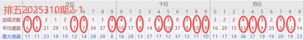 下图所圈出的为近30期各位置所出现的热码出现次数及平均遗漏值,用以参考和一些冷码组合选号。