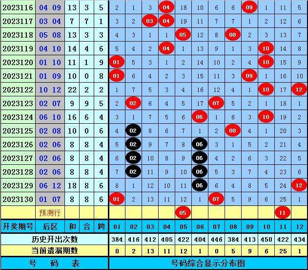 后区分析(定义:01-04为一区,05-08为二区,09-12为三区):上期后区开出奖号01和07,分别出现在第一区和第二区和区,最近10期后区三个区间落号个数比为7:8:5,本期后区注意第二区和第三区号码出现,关注两码05、11。