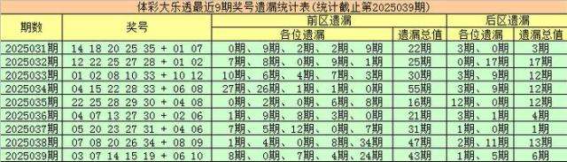 上期回顾:体彩大乐透第2025039期开出奖号为:03 07 14 15 19 + 06 10,其中前区各位奖号分别遗漏:8期、0期、7期、4期和24期,遗漏总值为43期,后区号码分别遗漏1期和5期,遗漏总值为6期。