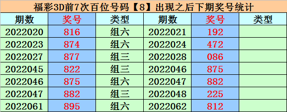 开奖回顾:福彩3D第2022062期开出奖号为812。组选类型为:组六,号码大小比为1:2,奇偶比为1:2。