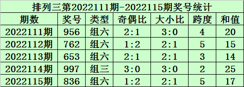 开奖回顾:排列三第2022115期开出奖号:836,类型为组六,和值为17,奇偶比为1:2,大小比为2:1,跨度为5。