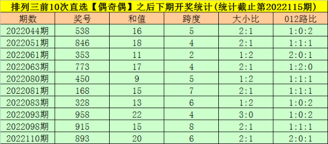 4。下期奖号和值分别为:16、18、11、17、9、15、13、22、15、20,和值奇偶比为6:4,大小比为7:3,和值012路比为4:3:3,本期注意小和值出现,参考和值10。