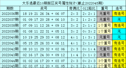 上期回顾:体彩大乐透第2022045期奖号为:02 03 07 12 20 + 01 05,其中前区号码012路比为2:1:2,奇偶比为2:3,包含2个重复号码:02、20。后区号码和值为6,跨度为4。