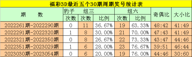 在最近一个30期周期内(第2023030期-第2023059期),豹子奖号没有出现,组三奖号开出了6次,所占比例为24%,组六奖号共出现19期,开出比例为76%,组六号码轮空1期,本期重点关注组六号码出现。