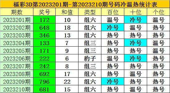 百位上期出现:热号6,该位连续十期以热号出现较多,以温号、冷号出现较少,本期该位温号有5个:3、4、5、8、9,看好温号转热,关注号码3。