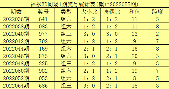 跨度:前5期跨度在3-5之间波动,振幅为3点,走势比较集中,上期开出跨度5,走高2点,本期预计跨度走高,关注跨度6。