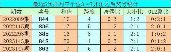 1、排列三前两期个位分别开出号码3和7,历史上个位号码连续两期分别出现3和7时,共有63次。在最近5次出现时,其下期分别出现号码:844、836、385、848、863;
