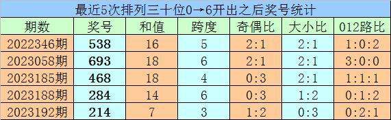 1、最近两期排列三十位号码开出号码分别为0和6,历史上十位号码连续两期同时出现号码0和6的奖号共开出70期。最近五次下期开出号码为:538、693、468、284、214;