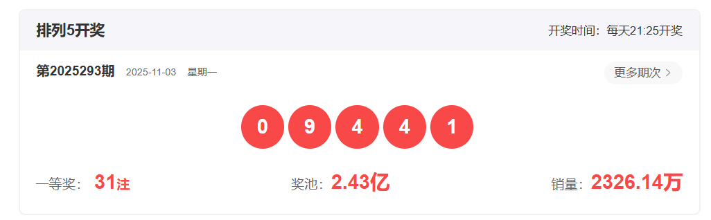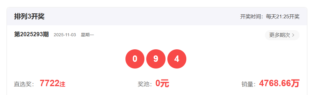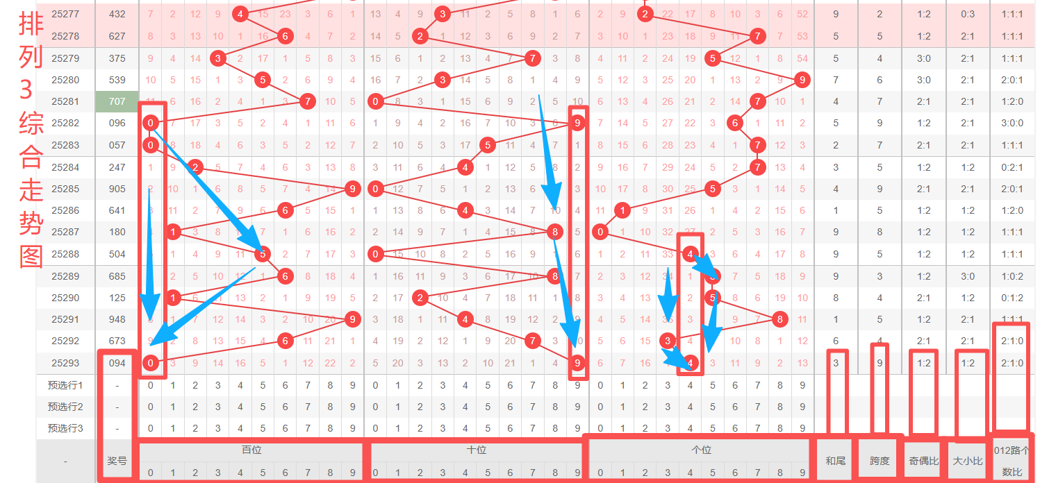 体彩排列3第2025293开奖号码094,形态为组六,奇偶比1:2,和值13,跨度9,大小比1:2,【012】路个数比2:1:0。