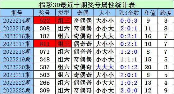 上期回顾:上期开奖奖号为309,类型:组六,奇偶奇,小小大,3:0:0,和值12,跨度9。