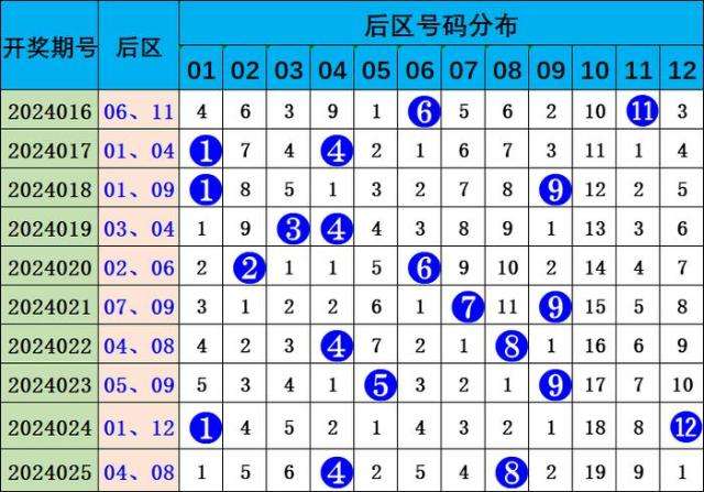前二区(13-24):上期该区开出1个奖号18,该区最近6期共开出7个前球,出号较冷,本期推荐该区奖号:16、23。