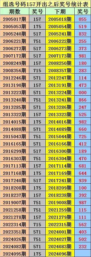 排列三组选157出现之后下期分别开出:055、519、832、255、373、981、180、283、114、473、000、866、247、525、982、660、725、412、189、470、681、644、939、100、392、987、115、111、562、403、502、232。