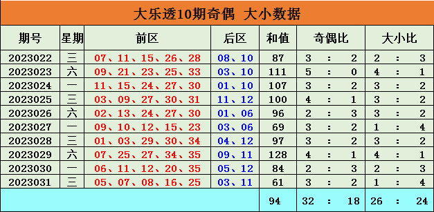 奇偶比分析:上期奇偶比3:2,近10期奇偶总比值为32:18,近3期奇偶总比值为9:6,奇数开出率高,综合分析,本期预计偶数多开出,推荐奇偶比2:3。