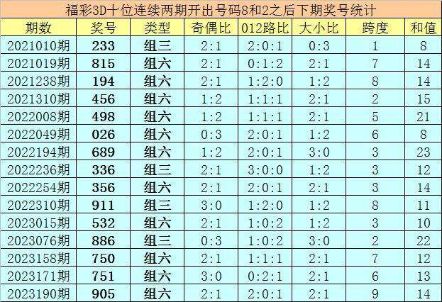 十位号码:前两期十位分别出现奖号8-2,历史上福彩3D连续前后分别开出号码8-2的现象共开出72次。在十位8-2的现象出现时,最近15期其下期分别开出号码:233-815-194-456-498-026-689-336-356-911-532-886-750-751-905;