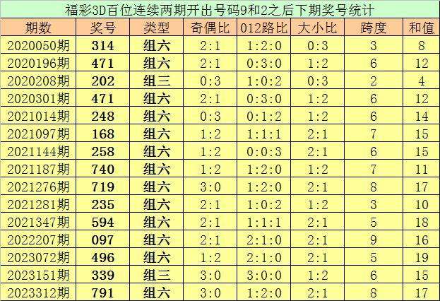 百位号码:连续两期百位出号分别为:9-2,历史上福彩3D连续两期前后分别出号9-2的奖号共出现73次。在百位9-2的奖号现象出现时,近15期下期分别出号:314-471-202-471-248-168-258-740-719-235-594-097-496-339-791;