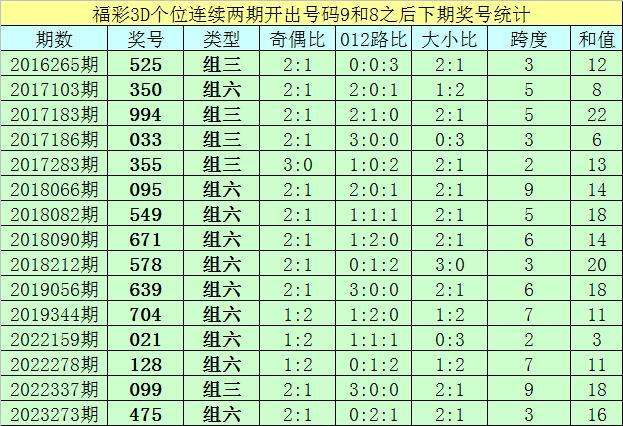 个位号码:最近两期个位开出号码为9-8,在福彩3D历史开奖中,前后两期个位分别开出号码9-8的奖号出现了78次。最近15期个位9-8组合出现之后,其下期奖号分别为:525-350-994-033-355-095-549-671-578-639-704-021-128-099-475;