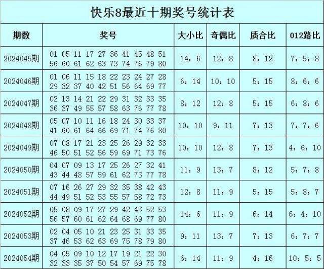 福彩快乐8第2024054期开奖回顾:04 05 09 10 12 17 19 21 22 30 32 33 35 37 50 54 57 69 75 78,其中奖号大小比开出6:14,奇偶比开出11:9,质合比开出4:16,012路比开出10:5:5。