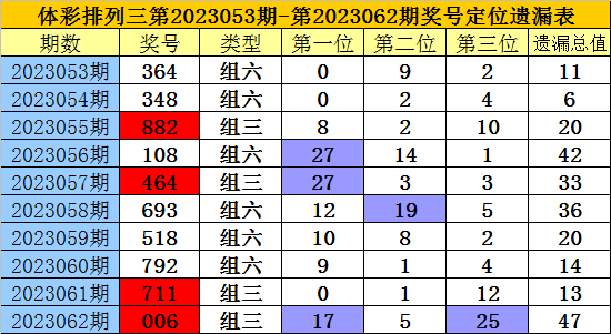 开奖回顾:排列三第2023062期奖号为:006,各位号码遗漏值分别为17、5、25,遗漏总值为47。