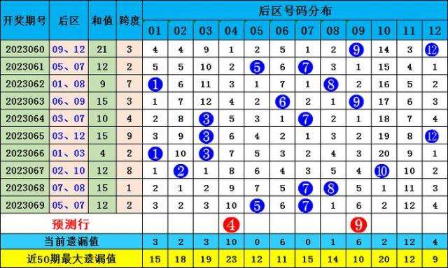 后区上期开出奖号05和07,为奇奇组合。近5期后区奇偶比为6:4,大小比为5:5。近10期后区奇偶比为13:7,大小比为11:9。预计本期小大偶奇组合热出,参考两码:04 09。
