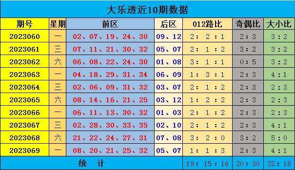 前区奇偶比为2:3,近10期奇偶比为20:30,偶数号稍微多出,本期预计偶数号码多出,奇偶比为2:3。