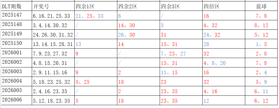 分享第一个数据分析:四分区统计数据。相对于传统的三分区,个人习惯使用四分区,就是把35个红球号码除以4,所得的余数分区如下: