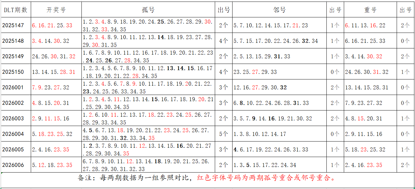 如图,以近两期数据为一组,进行对比分析,相同的孤号、邻号可能在下期开出。本期参考孤号:1.2.3.7.8.9.10.14.15.16.20.21.25.26.27.28.29.30.31.32.33;邻号:4.6.11.13.17.19.22.24.34。重点关注:孤邻号重合号码:***(会员专区可见)。个人分析,仅供参考。