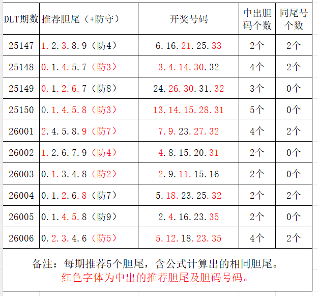 如图,每期推荐胆尾中出1-4个。上期推荐胆尾中出3尾4码!推荐胆尾是按照公式计算的顺序,不定位红球号码的顺序。本期推荐胆尾:5尾/4尾/2尾/3尾/9尾,加推防守胆尾+胆码号码:***(会员专区可见)。个人分析,仅供参考。