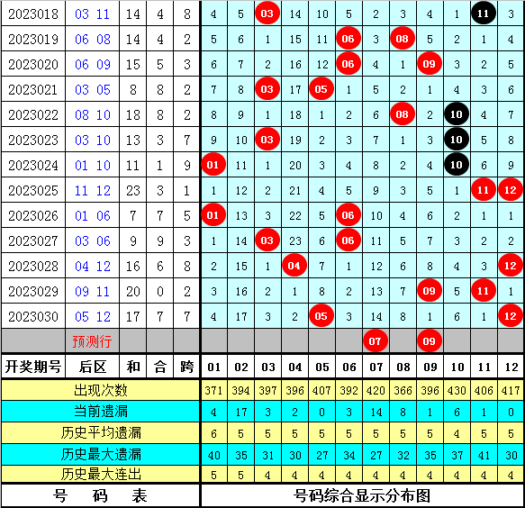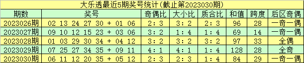 最近5期前区奇偶比分别开出2:3、3:2、3:2、4:1、2:3,奇偶比总比例为14:11,奇数号码走势较热,本期预计奇数号码继续热出,参考奇偶比3:2出现。