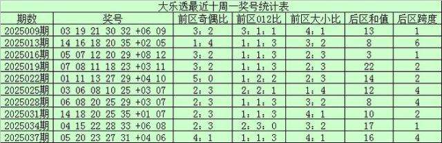大乐透第2025039期开奖号码为:03、07、14、15、19+06、10。其中前区奖号首尾间距为16,和值为58,奇偶比为4:1,大小比为1:4。