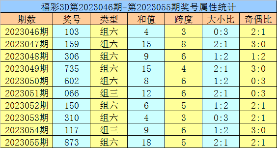开奖回顾:福彩3D第2023055期开出奖号873。奖号形态为组六,奇偶比为2:1,012路比为1:1:1,大小比为2:1,和值为18,跨度为5。