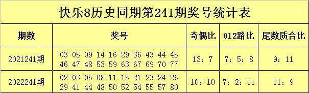 福彩快乐8第2023240期开出奖号:02 05 09 12 19 20 25 27 34 40 49 52 55 57 60 61 71 73 75 76,其中奖号奇偶比为12:8,012路比为6:10:4,尾数质合比为12:8。