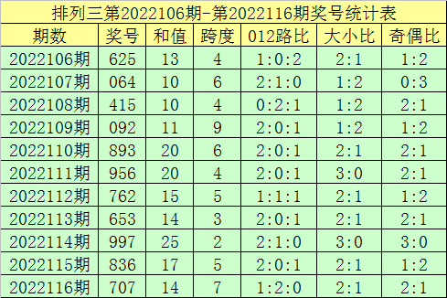 开奖回顾:排列三第2022116期奖号开出:707,组选类型:组三,大小比为2:1,奇偶比为2:1,和值为14,跨度为7。