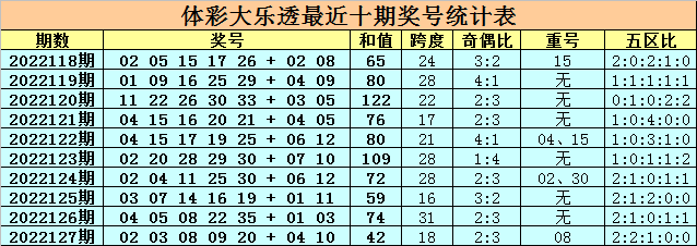 上期开奖:大乐透第2022127期奖号为:02 03 08 09 20 + 04 10,前区号码和值为42,跨度为18,奇偶比为2:3,重号:08,五区比为2:2:1:0:0。
