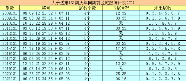 大乐透历年同期第131期后区尾数奇偶比为14:14,最近5年尾数奇偶比为4:6,后区尾数大小比为8:20,最近5年尾数大小比为3:7,本期后区注意号码02、03、05、07、09,后区两码关注02、09。