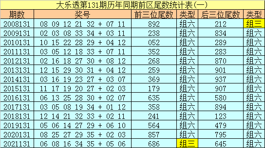 在大乐透第131期历年同期奖号中,前区前三位尾数出号频次分别为:尾数2、5出现7个,尾数6、8出现6个,尾数3出现5个,尾数9出现4个,尾数1、4、7出现2个,尾数0出现1个。其中尾数数字三类型豹子、组三、组六次数比为0:1:13,今年同期前三位尾数类型参考组六;