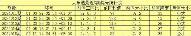 大乐透第2024015期奖号为,前区:08、11、14、24、31;后区:05、06。其中前区奖号大小比为2:3,三区比为2:1:2,和值为88,跨度为23。