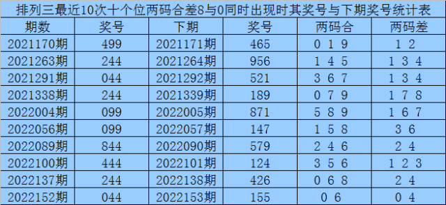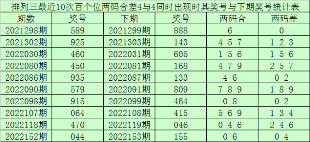 百个位合差分析:上期奖号百个位开出04组合,两码合为4,两码差为4,最近10次百个位两码合4与两码差4同时出现时,其奖号和下期奖号分别为: