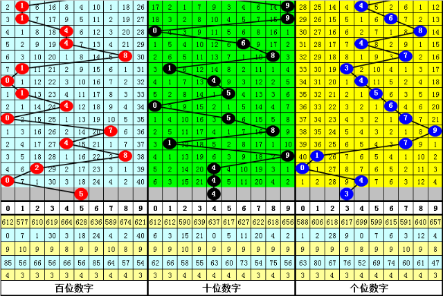从以上统计可以看出,百十位两码合差4与4同时出现之后其下期两码合差表现最热的4个分别为:0123,本期百十位两码合差可以参考这四码中的数据。