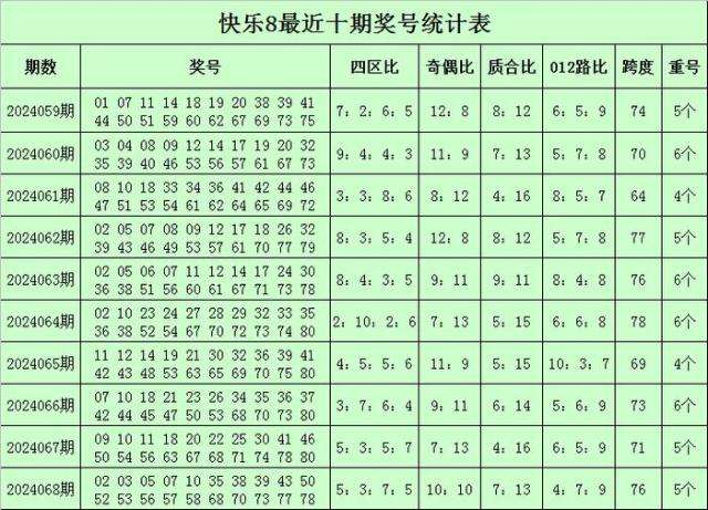 福彩快乐8第2024068期开奖回顾:02 03 05 07 10 35 38 39 43 50 52 53 56 57 58 68 70 73 77 78,其中奖号四区比为5:3:7:5,奇偶比为10:10,质合比为7:13,跨度为76,012路比为4:7:9,开出5个重号:10、50、56、68、78。