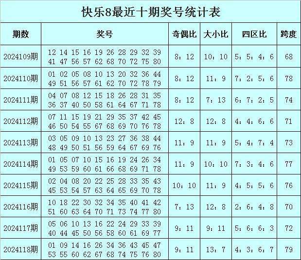 福彩快乐8第2024118期开奖回顾:01 09 14 16 26 34 36 43 45 47 53 55 60 62 67 68 74 75 76 80,其中奖号奇偶比开出9:11,大小比开出13:7,包含2个小奇号码:01 09,5个小偶号码:14 16 26 34 36,7个大奇号码:43 45 47 53 55 67 75,6个大偶号码:60 62 68 74 76 80。