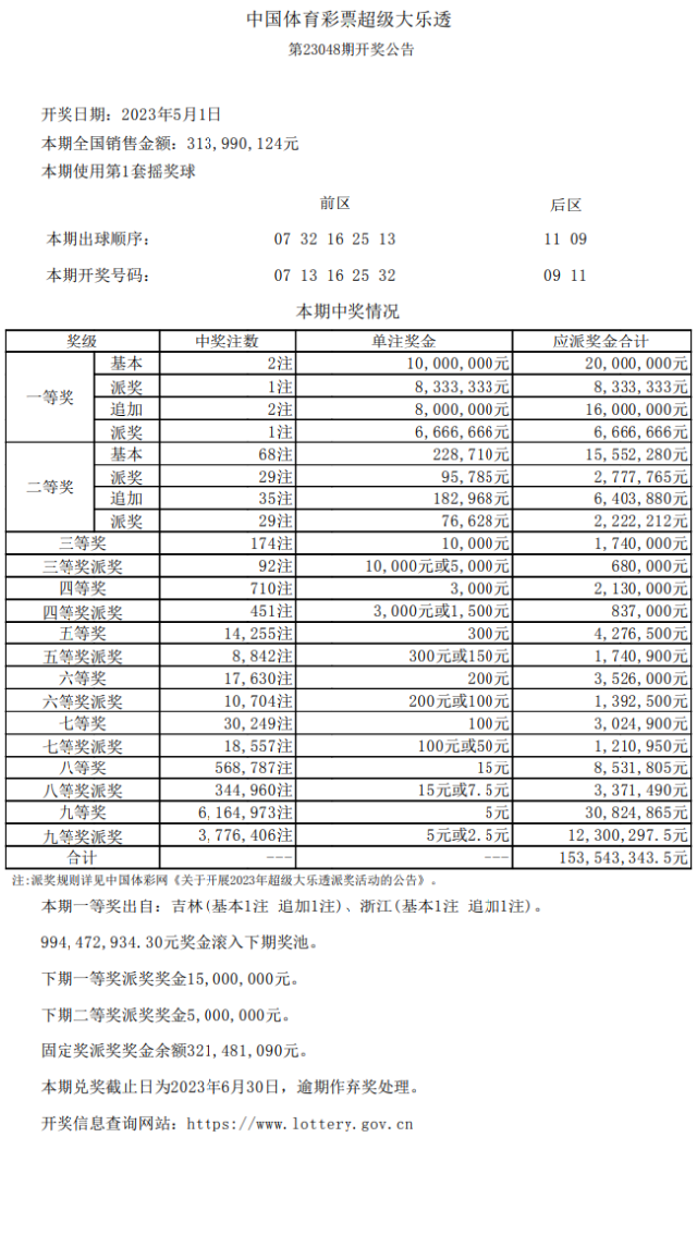 北京时间5月1日晚,体彩大乐透第23048期开奖,同时本期也是大乐透10亿大派奖的第10期开奖。当期开奖号码为:前区07 13 16 25 32,后区09 11。