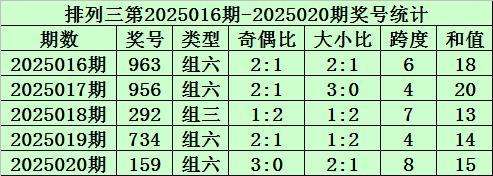 上期回顾:排列三第2025020期开奖号码为159。奖号类型为组六,奇偶比为3:0,大小比为2:1,跨度为8,和值为15。