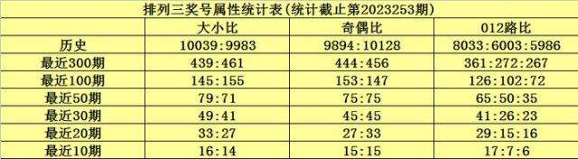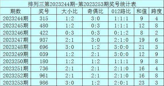 上期回顾:排列三第2023253期奖号为986,奖号012路比为2:0:1,奇偶比为1:2,大小比为3:0,和值为23,跨度为3。