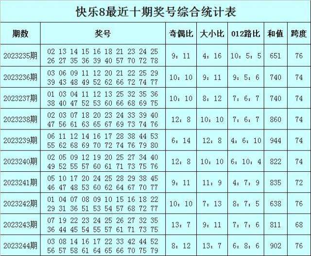 福彩快乐8第2023244期开出奖号:03 08 14 16 17 22 33 42 44 52 56 57 58 61 64 65 66 70 75 79,其中奖号奇偶比开出8:12,大小比开出13:7,和值开出902,跨度开出76,012路比开出6:8:6。