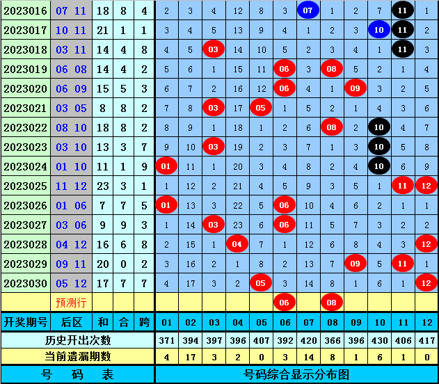 前第一区(01-12):上期开出3个奖号:06、11、12,最近10期该区没有断区,目前断区现象遗漏了29期,共出现18个奖号,本期注意前第一区走冷,防该区断区。