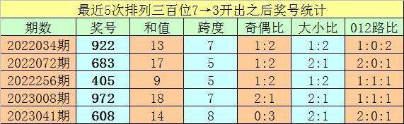 1、排列三最近两期百位号码分别开出7和3,历史上百位号码连续两期分别开出7和3的奖号出现了67期。前五期开出之后其下期奖号分别为:922、683、405、972、608;