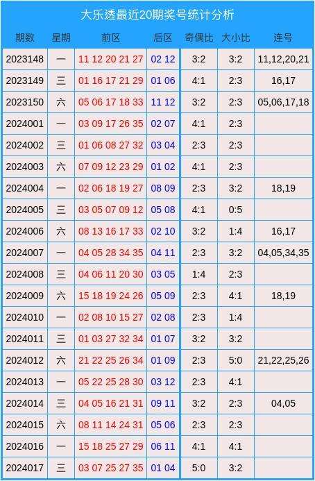 大小分析:在最近20期前区数据中,大小比为50:50,大数、小数出现相对平衡。上期前区大小比开出3:2,大数出现的比例较高。本期预测大数出现的比例较高,参考大小比为3:2。