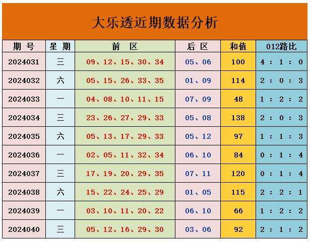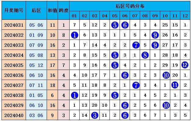 上期回顾:大乐透第2024040期奖号:前区05、12、16、29、30,后区03、06,前区奖号和值为92,三区比为2:1:2,后区开出小小组合03、06